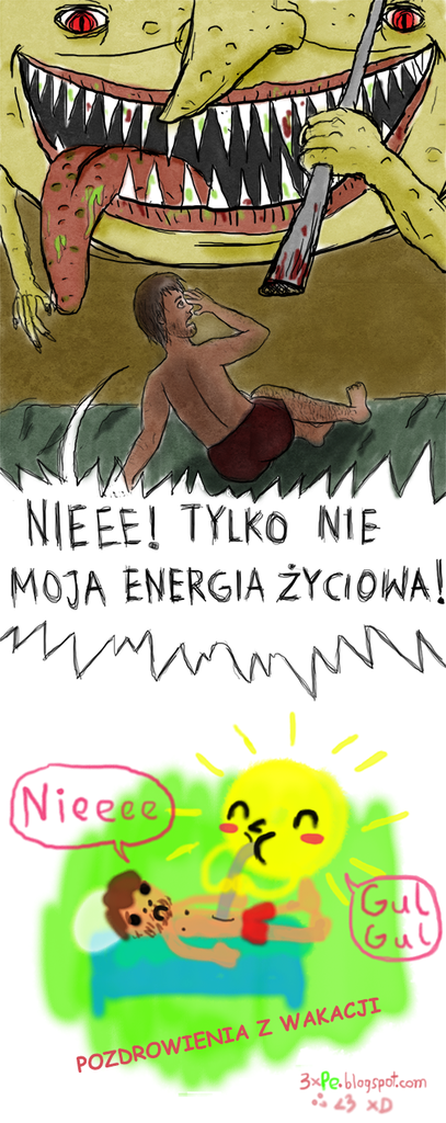 Nie lubię narzekać więc tylko ten jeden jedyny raz wyleję swoją wakacyjną frustrację tym oto komiksem. W tej chwili temperatura na szczęście spadła, ale narysowałem ten odcinek nieco wcześniej kiedy jeszcze powietrze przypominało bardziej koc niż mieszaninę gazów którą powinno być. W odcinku gościnnie wystąpiły malutkie eksperymenty ze stylem/ formą :)