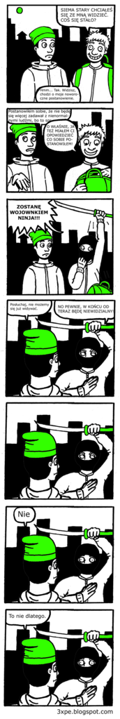 Tak dla wyjaśnienia: opinie bohaterów moich komiksów niekoniecznie pokrywają się z moimi. Sam kiedyś chciałem zostać ninja i nadal uważam, że to piękna profesja. Znam kilku ninja i wszyscy to bardzo mili goście, można pogadać i tak dalej. Chociaż w sumie muszę przyznać, że raz doświadczyłem przez jednego z nich nieprzyjemnej sytuacji. Byliśmy razem w tesco kupić jogurt i 5 kilo frytek aż tu nagle ochroniarz do nas podbiega i nas łapie z okrzykiem "pójdziecie ze mną drapichrusty!". I co się okazało? Kolega ninja skitrał frytki i jogurt za pazuchą bo te świry noszą zawsze tak przy sobie te swoje miecze, szurkieny itd. i po prostu automatycznie jak coś ma przenieść to to chowa. Muszę przyznać, że samo już to było rzeczywiście podejrzane i można by posądzić nas o chęć kradzieży. W precyzyjnej ocenie naszych prawdziwych intencji nie pomogło też z pewnością to, że kolega miał czarną maskę na ryju, bo oczywiście te półgłówki muszą je nosić 24h na dobę. No to ja próbuje załagodzić sytuacje, śmieję się, mówię: nie, nie Panie ochroniarzu kolega to nie żaden złodziej, tylko po prostu ninja, to nieporozumienie... A TEN WAŁKOŃ HYC NA PÓŁKĘ WSKAKUJE. I potem na następną, przeskakuje kasy i drąc się "Nigdy mnie nie złapiecie!" wyskakuje z okna na zewnątrz rozbijając szybę własnym ciałem. Chyba pomyślał, że ochroniarz to też jakiś ninja tylko, że z innego klanu i chce go załatwić. Cala sytuacja skończyła się tak, że spędziłem noc w areszcie i musiałem zapłacić za rozbitą szybę. Cholerni ninja, NIECH WAS PIORUN TRZAŚNIE.